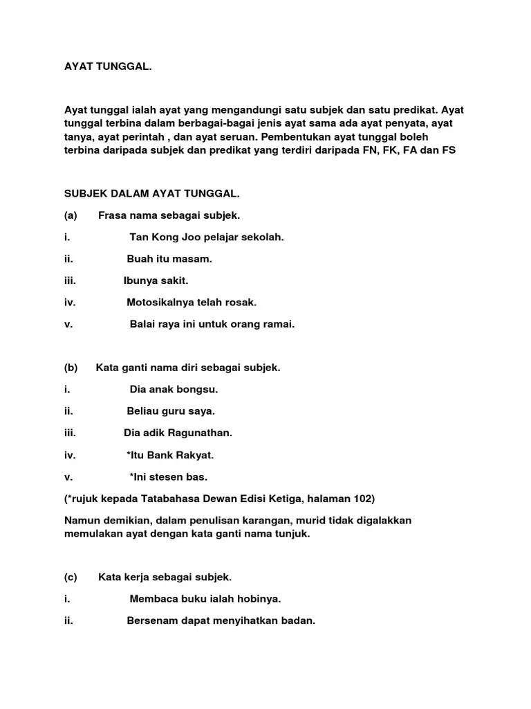 _____ terarium ialah ekosistem miniatur tumbuhan hiasan di dalam bekas. Berdasarkan petikan di bawah, kenal pasti dan tulis subjek dan predikat yang lengkap bagi tiga ayat yang anda pilih seperti yang berikut: Feb 04, 2018 · frasa menjadi subjek atau predikat dalam binaan ayat serta menjadi konstituen atau binaan kepada klausa.frasa terbahagi kepada empat, iaitu frasa nama, frasa kerja, frasa adjektif dan frasa sendi nama. Dalam setiap frasa ada perkataan yang yang dikenali sebagai inti frasa, iaitu perkataan yang paling penting dalam frasa.